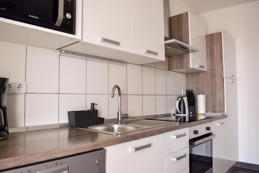The apartment has a fully equipped kitchen with an oven, hob, hood, kettle, coffee machine, dishwasher, refrigerator and microwave oven.